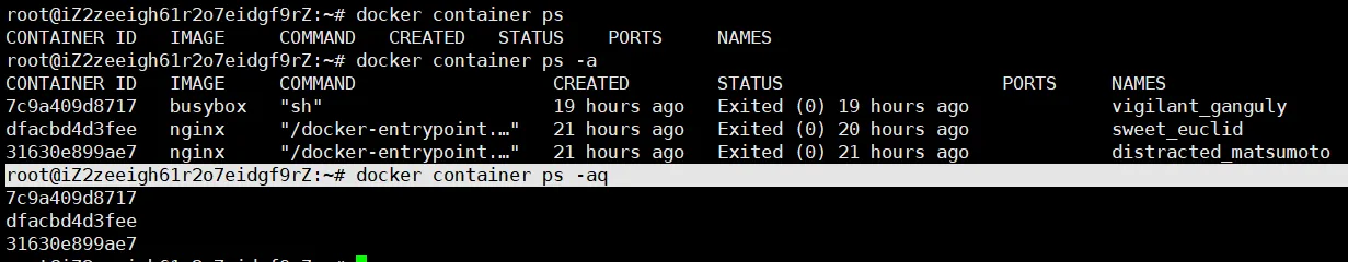 我们知道docker container ps 是查看运行中的容器,后面加上 -aq 参数可以查到所有的容器名,如下图所示:👇
